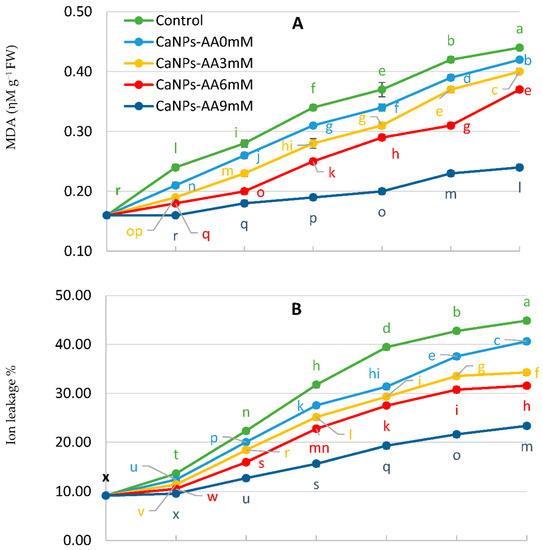 CI significantly impairs the storage of peach fruits, as measured by fruit loss over the course of a cold storage period. The 9 mM CaNP–AA treatment clearly ameliorated CI in peach fruit by improving AEAs and minimizing ion leakage. Thus, treatment with AA at 9 mM L−1 together with CaNPs suppressed the incidence of CI during cold stress, particularly in terms of ROS. It also activated antioxidant enzymes, which was reflected by the low MDA content throughout the cold storage period. Our results suggest that a mixture of AA with CaNPs could be used as a tool adjuvant to maintain fruit quality traits under cold storage.