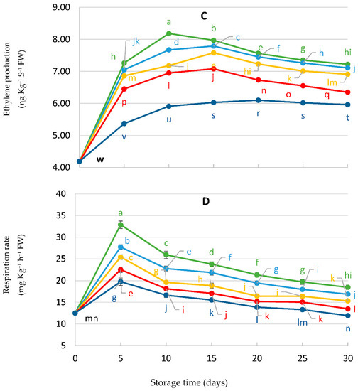 Ethylene concentrations and CO2 respiration were determined at 5-day intervals in five peaches. For all experimental treatments, fruits were placed and sealed in 1000 mL glass jars with a 1-h gap between each interval of cold storage duration (in days). Gas chromatography techniques were used to extract gas samples from the headspace atmosphere surrounding the fruit and analyze them for ethylene and carbon dioxide (GC). Ethylene concentrations were determined using a GC-6000 Vega Series from Carlo Erba Ins., Milano, Italy, while CO2 concentrations were determined using a GC PBI-Dansensor Checkmate-9900 from Denmark [40].