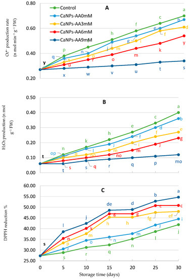 Differences in H2O2 and O2•− generation rates and antioxidant performance (utilizing the DPPH technique) could be seen as a function of time in days. The parameters produced a significant effect (p < 0.003) when the storage time and CaNP–AA applications were used as experimental factors (Figure 9).