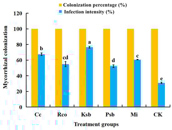 Effects of different microbial inocula on mycorrhizal colonization in the F. taipaiensis root system. The values are means ± standard deviation of 3 replicates (50 root segments per replicate) randomly selected from each treatment. Different lowercase letters indicate significant differences (p < 0.05) in the infection intensity among the six treatments. Cc: Claroideoglomus claroideum treatment group, about 1360 C. claroideum spores for each container; Rco: Racocetra coralloidea treatment group, about 1430 R. coralloidea spores for each container; Ksb: potassium solubilizing bacteria treatment group, 35 g Bacillus mucilaginosus inoculum for each container; Psb: phosphorus solubilizing bacteria treatment group, 35 g Bacillus megaterium inoculum for each container; Mi: mixed treatment group with mixed inoculum of C. claroideum, R. coralloidea, B. mucilaginosus, and B. megaterium, the application amount of each microbial inoculum was 1/4 of the former 4 groups; CK: control group, no microbial inocula were used.