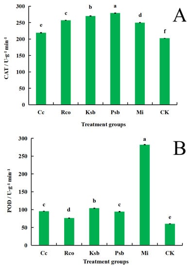 Soil enzyme activity was determined according to a previously described approach [,]. Briefly, invertase activity was determined by the 3,5-dinitrosalicylic acid colorimetric method, expressed in terms of the glucose content in 1 g dry soil 24 h (37 °C) after treatment. Urease activity was determined by the sodium chlorate-sodium phenol colorimetric method, expressed in terms of the amino nitrogen content in 1 g dry soil 24 h (37 °C) after treatment. Protease activity was determined by ninhydrin colorimetry, expressed in terms of the amino acid content in 1 g dry soil 24 h (50 °C) after treatment. Catalase activity was determined by pyrogallol colorimetry, expressed in terms of the theogallin content in 1 g dry soil 20 min (37 °C) after treatment. Phosphatase was determined by the sodium phenylene phosphate colorimetric method, expressed in terms of the phenol content in 1 g dry soil 24 h (37 °C) after treatment. Five biological replicates and three technical replicates were used in the assays above.