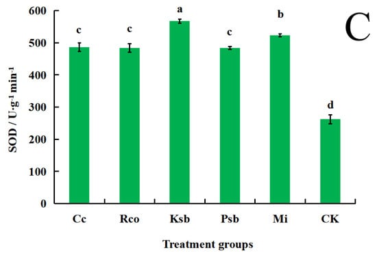 The biochemical indices of chlorophyll, soluble sugar, soluble protein contents, and enzyme activities in the leaves of medicinal plants can reflect their photosynthetic efficiency, health, and antioxidant capacity to a certain extent []. In this paper, we found that beneficial microorganisms in rhizospheric soil promoted the accumulation of photosynthetic pigments such as chlorophyll and improved carotenoid. The leaves of F. taipaiensis in the Psb group had the highest photosynthetic pigments content in this study. The reason may be consistent with a previous study: the phosphate solubilizing bacteria Bacillus megaterium can not only solubilize phosphate fixed in the soil to provide plants fertilizer, but can also stimulate the growth of plant by the secretion of cytokinin []. Soluble protein is an essential osmoregulation substance and nutrient in plants that can alleviate ion imbalances and physiological droughts caused by salt and drought stress [], which is involved in the stress resistance of plants. In this study, the soluble protein content in the leaves of the treatment groups were significantly higher than that in CK group, which is consistent with the result of a previous study [,]. Furthermore, other studies revealed that the increase in the leaf soluble protein content of plants can be caused by the increase of nitrate reductase enzyme activity, higher nitrogen fixation, and growth hormone production through AM fungi and microbial fertilizer application [,]. CAT, POD, and SOD in the plants can reduce membrane lipid peroxidation, maintaining and protecting the stability of the cell membrane structure and function []. In this study, the activities of CAT, POD, and SOD in the treatment groups were all significantly higher than that in CK, especially in the Mi group, which had the highest POD activity among the groups. This result is consistent with a previous study [] that reported multiple applications of AM fungi, potassium solubilizing bacteria and phosphate solubilizing bacteria had more distinguished effects on promoting antioxidant peroxidase activity in plants than single applications of them. The content of MDA could reflect the degree of cell damage, such as cellular lipid peroxidation and chlorophyll decomposition []. However, the MDA content of the leaves in the Ksb group were higher than in other groups, including the CK group: in the other groups, MDA levels were lower compared to the CK group. A previous study reported that the decrease of MDA content was not synchronized with increases of CAT, POD, and SOD content after the application of the potassium solubilizing bacteria Bacillus mucilaginosus. The MDA content in the leaves of the plant first briefly decreased and then increased when the potassium solubilizing bacteria application exceeded a certain level, while the contents of CAT, POD, and SOD kept an upward trend at the same time []. Therefore, the suitable amount of solubilizing bacteria required to assure the increase of CAT, POD, and SOD contents and a decrease of the MDA content simultaneously in F. taipaiensis is a subject worth exploring. In general, all these data suggest that beneficial microorganisms can promote the contents of photosynthetic pigment, osmoregulation substances, and the activity of superoxide dismutase in F. taipaiensis.