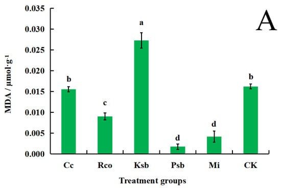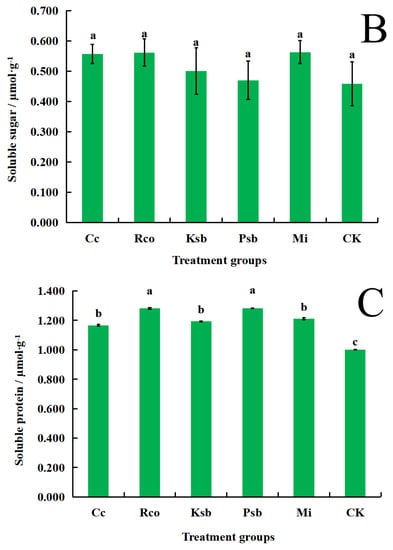 Effect of different microbial inocula on MDA (malondialdehyde), soluble sugar, and soluble protein content of F. taipaiensis leaves. Different lowercase letters indicate significant differences (p < 0.05) in the infection intensity among the six treatments. The values are means ± standard deviation of 5 plants randomly selected from each treatment. (A) MDA, (B) soluble sugar, and (C) soluble protein content in the leaves of each treatment group. Cc: Claroideoglomus claroideum treatment group, about 1360 C. claroideum spores for each container; Rco: Racocetra coralloidea treatment group, about 1430 R. coralloidea spores for each container; Ksb: potassium solubilizing bacteria treatment group, 35 g Bacillus mucilaginosus inoculum for each container; Psb: phosphorus solubilizing bacteria treatment group, 35 g Bacillus megaterium inoculum for each container; Mi: mixed treatment group with mixed inoculum of C. claroideum, R. coralloidea, B. mucilaginosus, and B. megaterium, the application amount of each microbial inoculum was 1/4 of the former 4 groups; CK: control group, no microbial inocula were used.