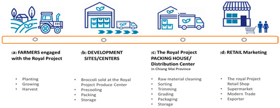 Fresh produce of the Royal Project Foundation, Thailand, sold at retail outlets generally moves through a four-step supply chain consisting of farms (contract growers), the Royal Project development center, a packing house facility in Chiang Mai (distribution center), and retail stores in different provinces, as illustrated in Figure 1. Research had previously examined precooling techniques as important factors that could increase the retail freshness of broccoli as well as maintain the highest quality with the longest practical shelf-life. This work aimed to examine the most appropriate commercial cooling techniques for broccoli, including commercial vacuum cooling and package icing for the supply chain of the Royal Project Foundation in Thailand. The research focuses on the potential shelf-life of produce as it arrived at the retail stores. This research explored appropriate techniques to improve shelf-life, maintain quality, and delay microbial growth in the supply chain using commercial vacuum cooling and package icing. The effects of vacuum cooling and package icing on visual appearance, physicochemical, microbial growth, and shelf-life of fresh broccoli heads were evaluated. Furthermore, the inhibition of decay from microorganisms affected by commercial vacuum cooling and package icing was also investigated.