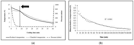 (a) Broccoli cooling curve, chamber pressure and temperature changes during the vacuum precooling process. (b) Relationship between the dimensionless temperature and time of broccoli precooled by package icing (△).