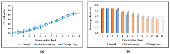 The weight loss percentage increased in every sample with storage duration and mostly in control samples, which exhibited faster quality deterioration. After harvest, the metabolic activities of vegetables, involving respiration and ripening, continue within cells until senescence and death. The higher the temperature at or after harvest directly affects respiration rate, resulting in reduced shelf-life and negative purchase decisions [40]. Besides the moisture loss from the precooling process, the respiration rate of broccoli was an important factor influencing shelf-life [41]. The effects of vacuum and package icing on the weight loss percentage of broccoli stored simulated retail refrigerated display are shown in Table 2 and Figure 3a. The results illustrated that the weight loss percentage of all samples increased; however, both precooled samples had a lower level of weight loss percentage than the control one. After 5 days of storage, the control samples showed rapid and significant weight loss percentages and had lower sensory scores (p ≤ 0.05) compared to the vacuum and ice-cooled samples. The results revealed that broccoli treated with package icing could retard the weight loss percentage and had a direct positive effect on the sensory quality (Table 2 and Figure 3a,b). Elansari et al. [19] also found that liquid ice cooling had a positive effect on the appearance throughout the supply chain; this method could keep the produce fresh for longer, including after reaching the end consumer.