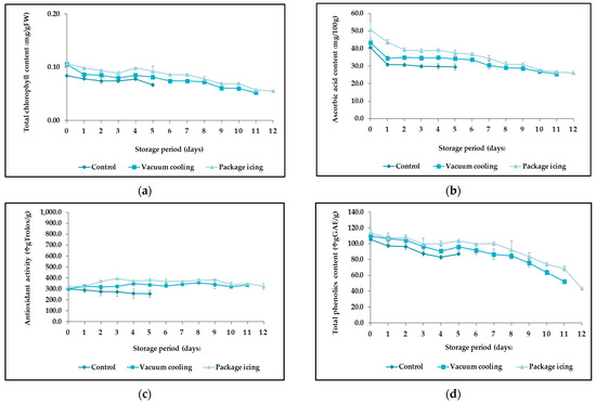 Broccoli is a cruciferous vegetable rich in vitamin C; the levels vary over 4-fold in broccoli. Inevitably, the temperature has negative impacts on vegetables. Therefore, postharvest cooling rapidly removes the field heat and reduces the deterioration process of fresh products [53]. In addition, it results in temperature reduction to the target value suitable for transport and storage [35]. The large effects of vacuum cooling and package icing on the ascorbic acid content of broccoli in this present study were higher than in the control samples. Precooling can prevent the deterioration of broccoli heads and lead to maintained content of vitamin C, as confirmed by Li et al. [54], who found that the cooling delay after harvest may increase respiration rate and metabolic activity. Ascorbic acid showed a significant difference (p ≤ 0.05) between vacuum-cooled, ice-cooled, and control samples during the entire storage period (Table 4 and Figure 4b). These results were also in agreement with Kitazawa et al. [55]; the cooling was effective in preventing ascorbic acid degradation during storage, and the lowest values of ascorbic acid content resulted from the non-cooled treatment. Similar effects were also observed by Han et al. [26], who indicated a positive effect of vacuum cooling, which maintained greater ascorbic acid content of the lettuce.