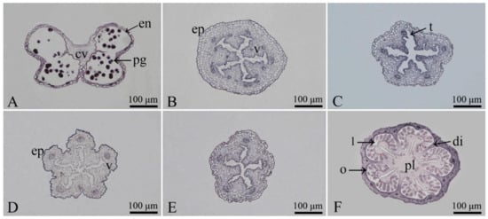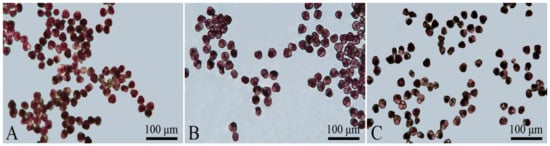 - Pollen germination observation method after artificial pollination. High viability pollen was used to artificially pollinate the stigmas in different flowering periods. Two days after pollination, the collected stigmas were fixed in Carnoy’s fluid (ethanol/acetic acid = 3/1) for 2 days, placed in 70% ethanol, and stored in a refrigerator. The materials were successively rehydrated with 50% and 30% ethanol and ultrapure water, softened for 8 h with 8 mol/L NaOH solution and kept overnight in ultrapure water; then, they were stained for 3–4 h by adding 0.1% aniline blue solution (0.1% aniline blue and 0.15 mol/L dipotassium phosphate) [23,24]. The materials were pressed into a tablet using standard procedures and observed under a fluorescence microscope (Leica DM3000, Germany) to determine whether the pollen on the stigmas germinated; the results were recorded, and photographs of the findings were taken. The receptivity was determined by the presence or absence of germinated pollen attached to the stigmas and was positively correlated with the amount of germinated pollen attached to the stigmas [25].