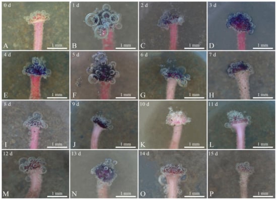 - Benzidine-hydrogen peroxide method (Table 3 and Figure 7). Benzidine-hydrogen peroxide solution was used to test the receptivity of R. pulchrum stigmas. Observation under a stereomicroscope revealed that the reactions of stigmas was not intense on the day before flowering (Figure 7A), with only a few bubbles on the stigma, indicating that receptivity was not strong. After 1–2 days (Figure 7B,C) of flowering, the receptivity gradually increased, and the stigma reaction was the most intense on the third and fourth days (Figure 7D,E) after flowering; at this time, there were numerous bubbles of a large radius, and the blue reaction liquid reached its peak, indicating that receptivity was strongest at this time. There was still a small amount of blue reaction liquid on the fifth to seventh day of flowering (Figure 7F–H), indicating that flowers were still receptive during this period, although the reaction was weaker than on the third and fourth days of flowering. The stigma began to turn black from the 8th to the 15th day (Figure 7I–P), and no blue reaction liquid was observed in this time. During this period, the receptivity further declined, with only minute bubbles, showing basically no receptivity. Therefore, we inferred that the period in which the stigma of R. pulchrum were most receptive was the third to fourth day of flowering.