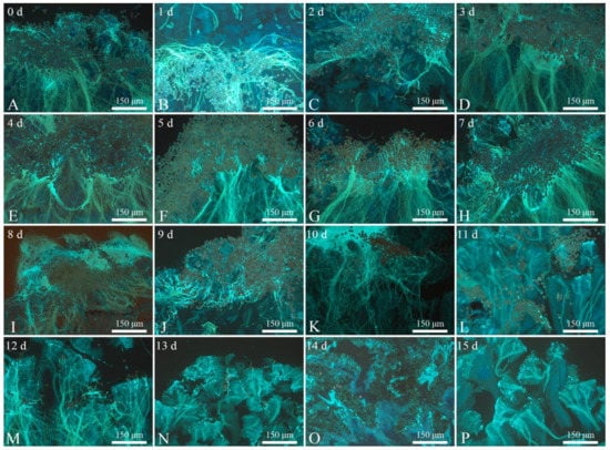 - Pollen germination observation method (Figure 8). After regular artificial pollination, we took images with a fluorescence microscope and found that on the day before flowering (Figure 8A), the pollen was attached to the stigma. Large quantities of germinated pollen grains were found attached to the stigma until the ninth day of flowering (Figure 8B–J). On the 10th day, the number of pollen grains attached to the stigma decreased significantly (Figure 8H). Clearly, the stigma had only weak receptivity at this time. There was basically no pollen germination from the 11th day to the 15th day (Figure 8L–P). The results of the two experimental methods were basically consistent.