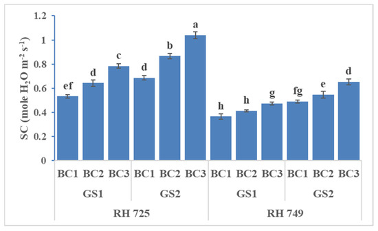 Figure 1. Comparisons of the effects of different concentrations of brassinolide sprays (BC1: control (water spray); BC2: 10 mg BRs/L water; BC3: 20 mg BRs/L water) on the stomatal conductance (SC) of drought-tolerant (RH 725) and drought-sensitive (RH 749) Indian mustard cultivars at the flower initiation (GS1) and 50% flowering (GS2) stages. Columns marked by different letters indicate significant differences (p < 0.05) between treatments based on Duncan’s multiple range test. Error bars denote the standard errors of the mean.
