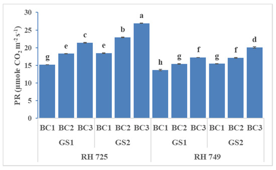 Figure 2. Comparisons of the effects of different concentrations of brassinolide sprays (BC1: control (water spray); BC2: 10 mg BRs/L water; BC3: 20 mg BRs/L water) on the photosynthetic rate (PR) of drought-tolerant (RH 725) and drought-sensitive (RH 749) Indian mustard cultivars at the flower initiation (GS1) and 50% flowering (GS2) stages. Columns marked by different letters indicate significant differences (p < 0.05) between treatments based on Duncan’s multiple range test. Error bars denote the standard errors of the mean.