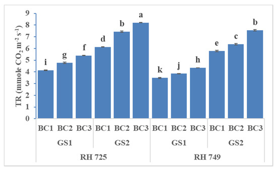 Figure 3. Comparisons of the effects of different concentrations of brassinolide sprays (BC1: control (water spray); BC2: 10 mg BRs/L water; BC3: 20 mg BRs/L water) on the transpiration rate (TR) of drought-tolerant (RH 725) and drought-sensitive (RH 749) Indian mustard cultivars at the flower initiation (GS1) and 50% flowering (GS2) stages. Columns marked by different letters indicate significant differences (p < 0.05) between treatments based on Duncan’s multiple range test. Error bars denote the standard errors of the mean.
