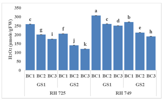 Figure 4. Comparisons of the effects of different concentrations of brassinolide sprays (BC1: control (water spray); BC2: 10 mg BRs/L water; BC3: 20 mg BRs/L water) on the hydrogen peroxidase (H2O2) concentration of drought-tolerant (RH 725) and drought-sensitive (RH 749) Indian mustard cultivars at the flower initiation (GS1) and 50% flowering (GS2) stages. Columns marked by different letters indicate significant differences (p < 0.05) between treatments based on Duncan’s multiple range test. Error bars denote the standard errors of the mean.
