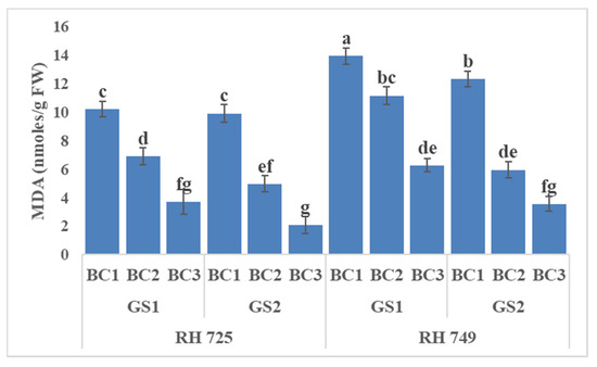 Figure 5. Comparisons of the effects of different concentrations of brassinolide sprays (BC1: control (water spray); BC2: 10 mg BRs/L water; BC3: 20 mg BRs/L water) on the malondialdehyde (MDA) concentration of drought-tolerant (RH 725) and drought-sensitive (RH 749) Indian mustard cultivars at the flower initiation (GS1) and 50% flowering (GS2) stages. Columns marked by different letters indicate significant differences (p < 0.05) between treatments based on Duncan’s multiple range test. Error bars denote the standard errors of the mean.