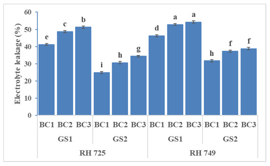 Figure 6. Comparisons of the effects of different concentrations of brassinolide sprays (BC1: control (water spray); BC2: 10 mg BRs/L water; BC3: 20 mg BRs/L water) on the electrolyte leakage (EL) concentration of drought-tolerant (RH 725) and drought-sensitive (RH 749) Indian mustard cultivars at the flower initiation (GS1) and 50% flowering (GS2) stages. Columns marked by different letters indicate significant differences (p < 0.05) between treatments based on Duncan’s multiple range test. Error bars denote the standard errors of the mean.