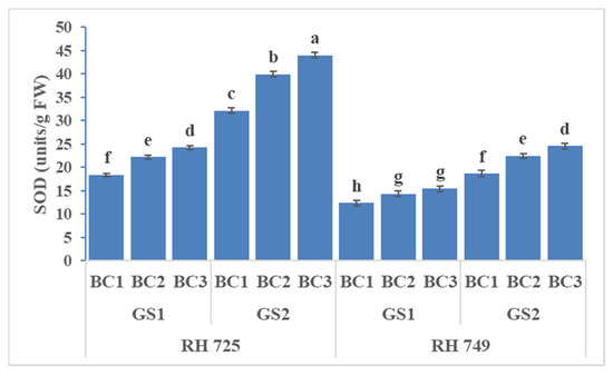 Figure 7. Comparisons of the effects of different concentrations of brassinolide sprays (BC1: control (water spray); BC2: 10 mg BRs/L water; BC3: 20 mg BRs/L water) on the superoxide dismutase (SOD) activity of drought-tolerant (RH 725) and drought-sensitive (RH 749) Indian mustard cultivars at the flower initiation (GS1) and 50% flowering (GS2) stages. Columns marked by different letters indicate significant differences (p < 0.05) between treatments based on Duncan’s multiple range test. Error bars denote the standard errors of the mean.