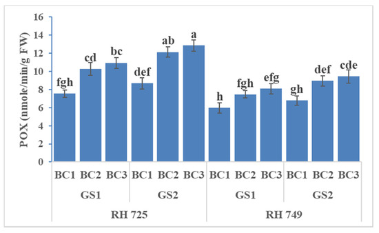 Figure 8. Comparisons of the effects of different concentrations of brassinolide sprays (BC1: control (water spray); BC2: 10 mg BRs/L water; BC3: 20 mg BRs/L water) on the peroxidase (POX) activity of drought-tolerant (RH 725) and drought-sensitive (RH 749) Indian mustard cultivars at the flower initiation (GS1) and 50% flowering (GS2) stages. Columns marked by different letters indicate significant differences (p < 0.05) between treatments based on Duncan’s multiple range test. Error bars denote the standard errors of the mean.