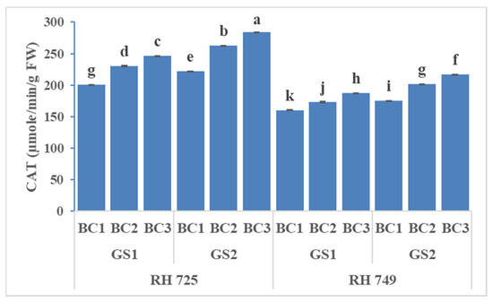 Figure 9. Comparisons of the effects of different concentrations of brassinolide sprays (BC1: control (water spray); BC2: 10 mg BRs/L water; BC3: 20 mg BRs/L water) on the catalase (CAT) activity of drought-tolerant (RH 725) and drought-sensitive (RH 749) Indian mustard cultivars at the flower initiation (GS1) and 50% flowering (GS2) stages. Columns marked by different letters indicate significant differences (p < 0.05) between treatments based on Duncan’s multiple range test. Error bars denote the standard errors of the mean.
