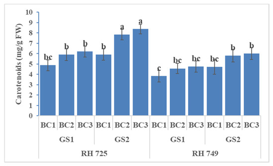 Figure 10. Comparisons of the effects of different concentrations of brassinolide sprays (BC1: control (water spray); BC2: 10 mg BRs/L water; BC3: 20 mg BRs/L water) on the carotenoids content (CC) of drought-tolerant (RH 725) and drought-sensitive (RH 749) Indian mustard cultivars at the flower initiation (GS1) and 50% flowering (GS2) stages. Columns marked by different letters indicate significant differences (p < 0.05) between treatments based on Duncan’s multiple range test. Error bars denote the standard errors of the mean.