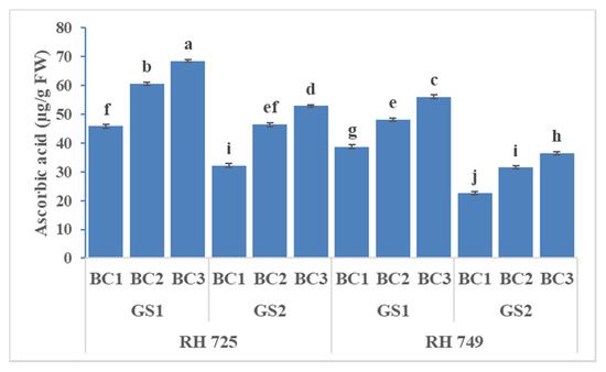 Figure 11. Comparisons of the effects of different concentrations of brassinolide sprays (BC1: control (water spray); BC2: 10 mg BRs/L water; BC3: 20 mg BRs/L water) on the ascorbic acid content (ASA) of drought-tolerant (RH 725) and drought-sensitive (RH 749) Indian mustard cultivars at the flower initiation (GS1) and 50% flowering (GS2) stages. Columns marked by different letters indicate significant differences (p < 0.05) between treatments based on Duncan’s multiple range test. Error bars denote the standard errors of the mean.