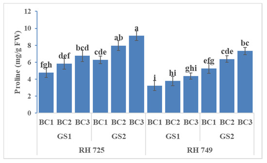 Figure 12. Comparisons of the effects of different concentrations of brassinolide sprays (BC1: control (water spray); BC2: 10 mg BRs/L water; BC3: 20 mg BRs/L water) on the proline content (PRO) of drought-tolerant (RH 725) and drought-sensitive (RH 749) Indian mustard cultivars at the flower initiation (GS1) and 50% flowering (GS2) stages. Columns marked by different letters indicate significant differences (p < 0.05) between treatments based on Duncan’s multiple range test. Error bars denote the standard errors of the mean.