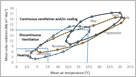 One of the most important factors, which plays a fundamental role in greenhouse energy requirements, is climate control (e.g., control of air temperature, relative humidity and light). Under Mediterranean climatic conditions, greenhouse optimal climate control requires the operation of heating, ventilation and cooling systems accounting for 70–85% of the total yearly greenhouse operating costs [,]. Thus, the challenge is to increase energy efficiency (i.e., product yield per unit of energy) in Mediterranean greenhouses in a sustainable manner under recent environmental challenges [,]. This can be achieved through the introduction of novel technologies as well as the incorporation of renewable energy sources and the development of smart energy management algorithms. For example, from climograph (i.e., a graphical representation of monthly averages of solar radiation and air temperature, Figure 1), it can be concluded that in northern European countries, the greenhouse climate can be effectively controlled throughout the year only by the operation of heating and the intermittent operation of ventilation systems. Under Mediterranean climatic conditions, greenhouse improvements require the year-round operation of heating, ventilation and cooling systems.