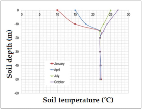 To improve the greenhouse energy efficiency in Mediterranean greenhouses, measures should be taken by farmers to reduce energy losses and consumption of heating oil. One such measure is the replacement of heating oil with gas (e.g., natural gas, biogas) or with renewable energy sources, such as aerothermal, solar, biomass, or geothermal energy. However, the heat pumps that use hydrothermal, geothermal or aerothermal heat applications have higher requirements in regard to temperature, electrical or other auxiliary energy. Therefore, the energy used to operate the heat pumps should be subtracted from the useful thermal energy they provide. In this content, the Directive 2009/28/EC [] of the European Parliament and Council on the promotion of renewable energy use takes into account only heat pumps that provide a significantly higher percentage of heat energy than that consumed for their operation. It seems that the most economical type is the air-to-water pump due to the lower initial installation cost []. In such a type of heat pump, the heat is pumped from the atmospheric air and does not require costly drilling as in the case of geothermal pumps. However, during the heating period, its efficiency varies according to the required temperature in the greenhouse and to that of the outside. In the case of geothermal heat pumps, the cost increases due to the high cost of drilling required to install heat exchangers in soil. Alternatively, by exploiting shallow geothermal energy, greenhouses can be heated by taking advantage of the constant soil temperature []. Shallow geothermal energy is the energy stored in the form of heat of the earth’s crust, at depths up to 200 m and with subsoil temperatures up to 18 °C. This energy comes from the absorption of solar radiation (almost 50% of the total amount that reaches the earth) from the earth’s surface. Throughout the year, in the latitudes of the temperate zone, it remains approximately constant below some depth at 22 °C (Figure 2). Regarding the cost of installation of these systems, a corresponding techno-economic study must be carried out in each case, taking into account the local market’s economic environment (prices, labor). The heating system using shallow geothermal energy was tested for greenhouse vegetable production in two countries of the eastern Mediterranean region (i.e., Cyprus and Greece) (see adapt2change LIFE project, https://www.adapt2change.org/en/home, accessed on 2 November 2021 []). The results indicated savings in the first-year energy consumption above 60% in a greenhouse using shallow geothermal energy for heating as compared to a greenhouse heated with heating oil.