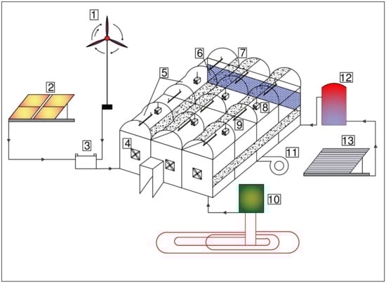 Technologies for energy and climate control in the greenhouse: 1, wind turbine; 2, photovoltaic panel; 3, battery bank and inverter; 4, forced air ventilation system; 5, photo selective greenhouse cover; 6, evaporative pad; 7, natural air ventilation system; 8, air circulation fans; 9, artificial lighting; 10, ground source heat pump system; 11, CO2 generator; 12, heat storage unit, 13, solar collector.