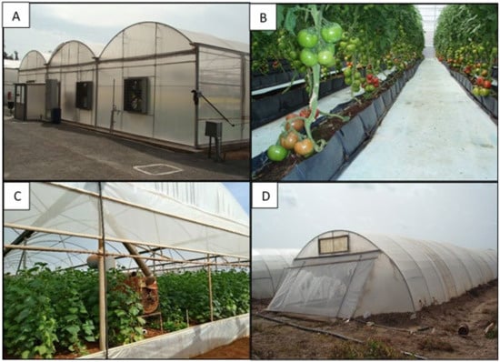 Figure 3 shows the different types of greenhouses commonly used in the Mediterranean region. Modern greenhouse systems (where the indoor climate can be controlled completely independently of the outdoor climate; Figure 4A) and soilless-based systems (Figure 4B) are increasingly used in some cases, promoting the efficient use of resources. However, since the majority of greenhouses and tunnels are low-to-medium technology (Figure 4C,D), suboptimal growing conditions are usually associated with high addition of fertilizers and pesticides [,].