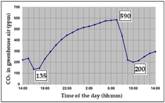 The typical evolution of CO2 concentration in greenhouse air, in a free ventilated greenhouse under Mediterranean climatic conditions with cucumber cultivation, is plotted in Figure 5, which shows the variation in CO2 levels during the day without an artificial CO2 supply (Cyprus Agricultural Research Institute, unpublished data). When there is a low ventilation rate and high solar irradiation, CO2 can sink to very low levels that can affect plant growth and final yield production per drop of water and unit of energy. Ventilating a greenhouse under sunny but chilly days implies a trade-off between inflow of CO2 and maintaining an adequate temperature within the greenhouse [].