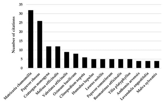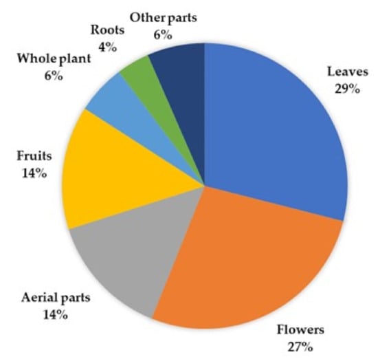 As shown in Figure 1, leaves (29%) and flowers (27%) are the most frequently used plant parts. This is probably due to do the fact that leaves, besides photosynthesis, are also used as synthetic and storage organs for secondary metabolites such as phenols and terpenoids (essential oil), while flowers, which often have an aromatic smell, are mainly composed of terpenes, flavonoids, and aromatic compounds [102]. These secondary metabolites are the most responsible for the sedative properties used to treat sleep disorders and anxiety. Additionally, harvesting of leaves, instead of roots or the whole plant, allows for the sustainable utilization of the plants, hence promoting their conservation [103].