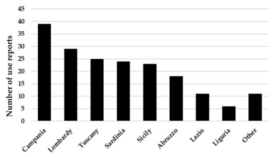 From the analyses carried out at a regional scale, Campania has the highest number of records of plants used in GAD (39), followed by Lombardy (29) and Tuscany (25) (Figure 2).