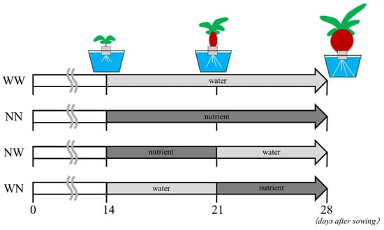 A previous study of hydroponic radishes demonstrated that continuous low nutrient treatment decreased shoot growth, whereas root growth was not significantly influenced [29]. The NW plants showed a similar growth pattern to this previous study. Hydroponic plants are known to have large amounts of mineral nutrients in the leaves that have been absorbed from the nutrient solution [30]. Thus, in the NW plants, the stress caused by nutrient deficiency may have been mitigated by the leaf minerals that were acquired before the start of the nutrient deficiency. In contrast, taproot growth was restricted in the WN plants. Because the timing of nutrient deprivation was earlier in the WN plants compared to in the NW plants, the WN plants underwent nutrient deficiency during a younger growth stage. Younger plant leaves contain lower nitrate levels than older leaves [31,32]. This indicates that younger plants might be more sensitive to nutrient deficiency due to the low nutrient stocks in their leaves. Given that the increase in taproot diameter was also suppressed from 4–7 DAT in the WN and WW plants, it is postulated that complete nutrient removal at the early taproot growth stage is detrimental to taproot development. In potato plants, nutrient uptake has been reported to be higher at the tuber initiation stage than at the maturation stage [33]. Therefore, radish plants may also require a higher amount of nutrients at the initial taproot growth stage.