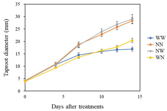 In the NN and NW plants, taproot diameter consistently increased during the 14 days of the experiment (Figure 2). The WN and WW plants showed a lower increase in taproot growth compared to the NN and NW plants in the first 7 DAT. In the last 7 days before harvest, the WN plants showed a higher increase in taproot growth compared to the WW plants, but the taproot diameter at 14 DAT was lower than that of the NN and NW plants.