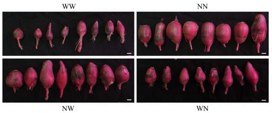 The plants were harvested at 14 DAT, and the growth and components were then examined. The hydroponically grown taproots were oblong- or spindle-shaped (Figure 3). The size of the taproots was larger in the NN and NW plants compared to in the WN and WW plants. The swelling of the lower part of the taproot was suppressed in all of the experimental groups, which was probably because these parts were submerged in the hydroponic solution. Waterlogging has also been reported to restrict root swelling in root vegetables such as carrot and sweet potato [26,27,28].