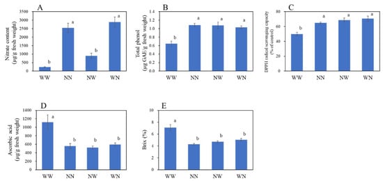 The nitrate content of taproots at 14 DAT was higher in the NN and WN plants compared to in the WW and NW plants (Figure 4A). The total phenol content was lower in WW plants compared to in the other experimental groups (Figure 4B). The radical scavenging capacity of the taproot measured by DPPH was also lower in the WW plants compared to in the other experimental groups (Figure 4C). In contrast, the ascorbic acid content was higher in the WW plants compared to the other experimental groups (Figure 4D). Brix, which is an index of sugar content, was also higher in the WW plants (Figure 4E).