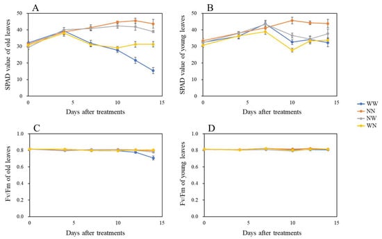 Time-course changes in radish leaf SPAD and photosynthetic quantum yield of photosystem II after the start of the nutrient deficiency experiment. SPAD value of old leaves (A) and young leaves (B). Photosynthetic quantum yield of photosystem II (Fv/Fm) of old leaves (C) and young leaves (D). Vertical bars represent the means ± SE (n = 8). WW, nutrient deficiency for 14 days; NN, full nutrient for 14 days; NW, nutrient deficiency for the last 7 days; WN, nutrient deficiency for the first 7 days.