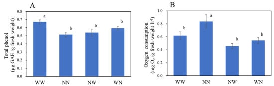 Total phenol content (A) and oxygen consumption (B) of fibrous roots of hydroponic radish at 14 days after the start of the experiment. Vertical bars represent the means ± SE (n = 8). Different letters indicate significant differences among the treatments at p < 0.05 by Tukey–Kramer’s test. WW, nutrient deficiency for 14 days; NN, full nutrient for 14 days; NW, nutrient deficiency for the last 7 days; WN, nutrient deficiency for the first 7 days.