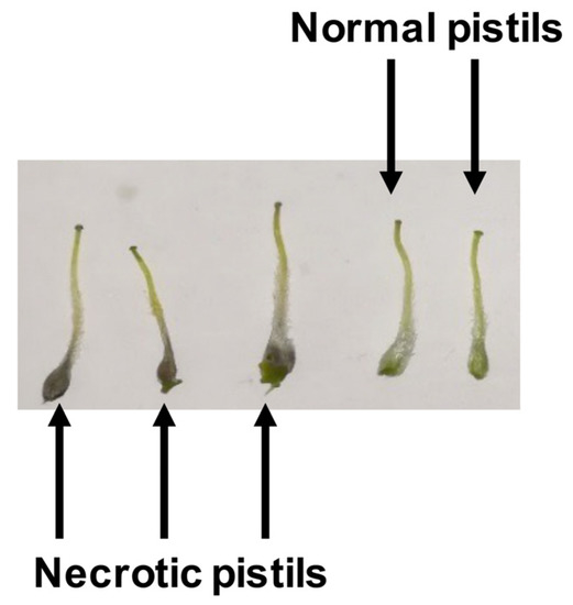 A total of 100 pistils of the treated flowers were taken at each time point (0, 2 and 24 h) for each genotype. Browning pistil-tissue (necrotic pistil) was counted and evaluated as a cold-damage symptom [13]. Cold damage was measured as the percentage of necrotic pistils.