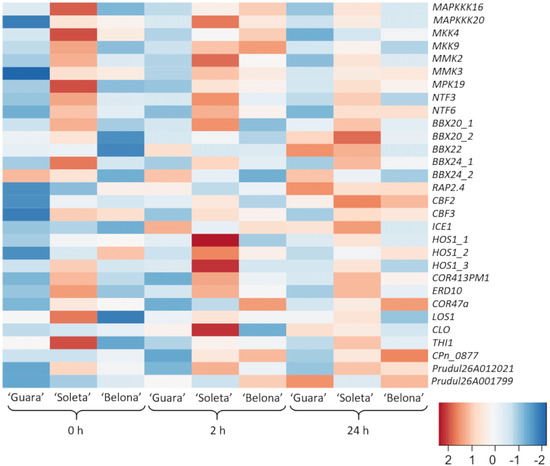 It is noteworthy that when the samples of ‘Soleta’ and ‘Belona’ were collected, at the 0 h time-point, the ambient temperature was 0.74 °C, while for ‘Guara’ was 5.85 °C. This lowered temperature registered from ‘Soleta’ and ‘Belona’ could explain the overexpression in these genotypes at 0 h shown by several stress-responsive genes in the experiment (Figure 2). These two genotypes could have activated their cold-response signaling mechanisms earlier, while ‘Guara’ had not already perceived the stress stimulus. This behavior in ‘Guara’ was also observed at 2 and 24 h. We did not observe many differentially expressed genes in ‘Guara’ either (i) because the response pathway requires fewer genes or was never triggered; (ii) that analyzed genes are not involved in ‘Guara’ response; or (iii) the cold-stress response occurs after 24 h, thus not being detectable in our experimental setup.