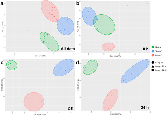 Principal Component Analysis (PCA) showing the genotype distribution based on gene expression and injury percentage, as well as the gene expression influence on the cold response in ‘Guara’, ‘Soleta’ and ‘Belona’ cultivars (a) for all data, (b) at 0 h, (c) at 2 h and (d) at 24 h of cold treatment.
