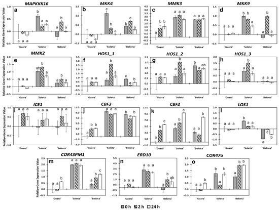 Relative gene expression profiles of the studied genes involved in the ICE-CBF-COR pathway. (a) MAPPPK16, (b) MKK4, (c) MMK3, (d) MKK9, (e) MMK2, (f) HOS1_1, (g) HOS1_2, (h) HOS1_3, (i) ICE1, (j) CBF3, (k) CBF2, (l) LOS1, (m) COR43PM1, (n) ERD10, (o) COR47a. Error bars represent the standard error among replicates. Letters indicate statistical differences following Tukey’s honest significant difference (HSD) test (p < 0.05) among hours for each genotype.