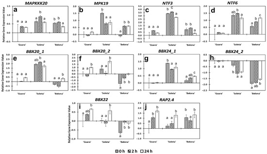 Relative gene expression profiles of the studied genes involved in CBF-independent response to cold. (a) MAPPPK20, (b) MPK19, (c) NTF3, (d) NTF6, (e) BBX20_1, (f) BBX20_2, (g) BBX24_1, (h) BBX24_2, (i) BBX22, (j) RAP2.4. Error bars represent the standard error among replicates. Letters indicate statistical differences following Tukey’s honest significant difference (HSD) test (p < 0.05) among hours for each genotype.