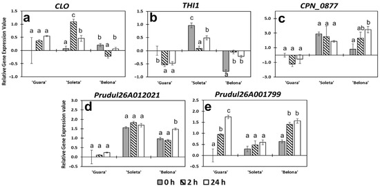 Relative gene expression profiles of genes encoding for other functional and uncharacterized proteins. (a) CLO, (b) THI1, (c) CPn_0877, (d) Prudul26A012021, (e) Prudul26A001799. Error bars represent the standard error among replicates. Letters indicate statistical differences following Tukey’s honest significant difference (HSD) test (p < 0.05) among hours for each genotype.