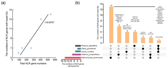 Exogenous fusion domains of NLR genes in D. jenkinsiana, C. nucifera, C. simplicifolius, E. guineensis and P. dactylifera. (a) Spearman correlation between the total number of species’ NLR genes and the number of NLR genes fused IDs. r represents the correlation coefficient, p < 0.05. (b) Extraneous domains of NLR gene-specific fusions or convergent fusions among different species in the Arecaceae species. Black circles indicate exogenous fusion domain presence, and gray circles indicate exogenous fusion domains non- presence.