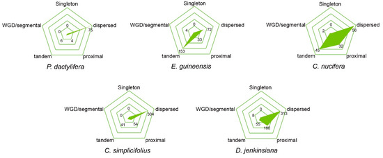 Type of gene duplication in C. simplicifolius, D. jenkinsiana, P. dactylifera, E. guineensis and C. nucifera, respectively.