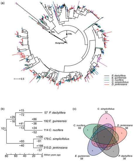 The Arecaceae consists of 183 genera and 2450 species, which are distributed throughout the tropical and subtropical areas in Africa, the Americas, Asia, Madagascar, and the Pacific, and widely grown as ornamentals in botanical gardens (Flora of China, www.iplant.cn/foc/, accessed on 2 August 2021). Recently, the genome of five horticultural plants from the Arecaceae family of the Arecales, including Elaeis guineensis (2n = 32), Phoenix dactylifera (2n = 36), Daemonorops jenkinsiana (2n = 24), Cocos nucifera (2n = 32) and Calamus simplicifolius (2n = 26), were sequenced and made available [16,17,18,19]. Among them, oil palm (E. guineensis) is a source of vegetable oil and has very important economic value [20], date palm (P. dactylifera) is the most popular fruit in the Middle East and North Africa, and C. nucifera is widely distributed on Earth and has considerable food and medicinal value [21]. These horticultural plants are faced with infection by various pathogens during their lifespan. However, the composition and evolutionary pattern of NLR genes in the Arecaceae family have rarely been investigated [22,23]. Deciphering the evolutionary pattern of NLR genes among the five Arecaceae species would provide an additional example of dynamic NLR gene evolution across species speciation in the monocot lineage. Additionally, the obtained NLR information may serve as a primary resource for the disease resistance breeding of the Arecaceae species.