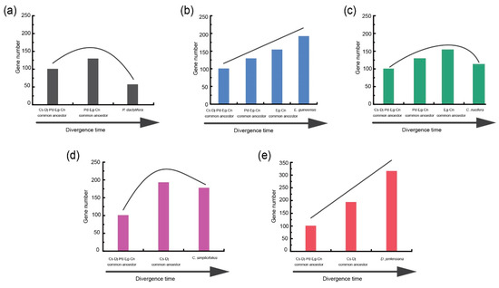 Based on the traced loss and gain of NLR genes at each species divergence node, the evolutionary trajectory of NLR genes for each of the five species can be traced. After separation from the common ancestor of the five Arecaceae species (Cs-Dj-Pd-Eg-Cn node), 40 gene-loss and 93 gain events were detected at the Cs-Dj node (Figure 3b), suggesting a pattern of NLR expansion during this period. The Cs-Dj node then diverged to generate C. simplicifolius and D. jenkinsiana. In C. simplicifolius, 81 NLR genes inherited from the Cs-Dj were lost, while the remaining NLR genes underwent intensive gene duplication, leading to the generation of 106 new members (Figure 3b). Again, a pattern of NLR expansion occurred during the period from Cs-Dj to C. simplicifolius. Taken together, a “consistent expansion” of NLR genes occurred during the evolution of C. simplicifolius from the common ancestor of the five Arecaceae species (Figure 4d). Using this strategy, a similar pattern of “consistent expansion” was also observed for NLR genes in D. jenkinsiana and E. guineensis (Figure 4b,e). However, a different pattern of “first expansion and then contraction” was observed for the other species, P. dactylifera and C. nucifera (Figure 4a,c).