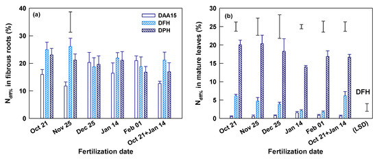 3.2. 15N in Fibrous Roots and Mature Leaves